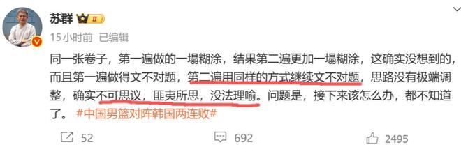 赛后名嘴苏群发文暗指郭士强没有任何调整:“同一张卷子,第一遍做的一塌糊涂,结果第二遍更加一塌糊涂,这确实没想到的,而且第一遍做得文不对题,第二遍用同样的方式继续文不对题,思路没有极端调整,确实不可思议,匪夷所思,没法理喻。问题是,接下来该怎么办,都不知道了。”